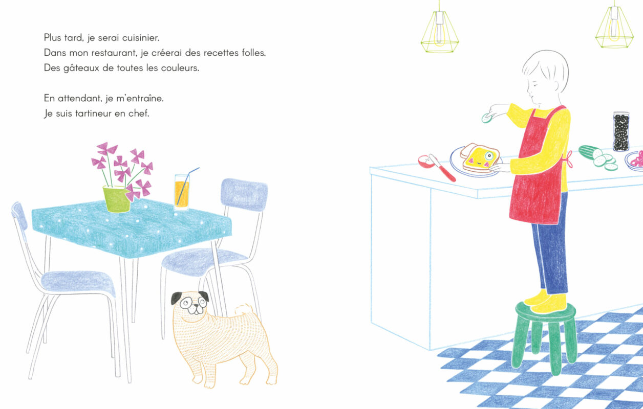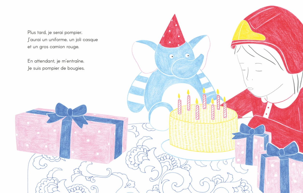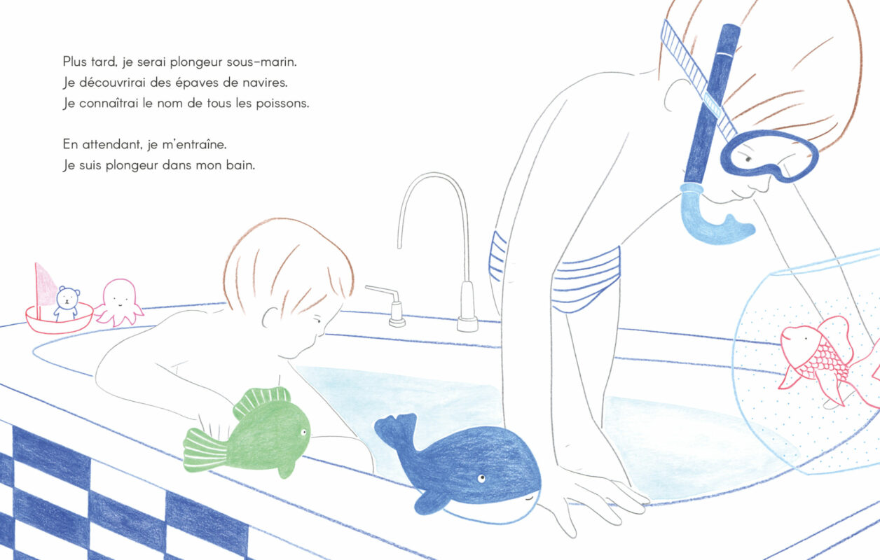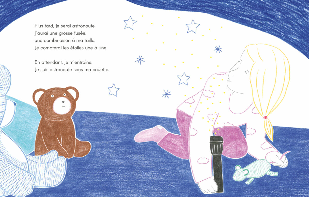 Les illustrations délicates aux couleurs franches laissent de la place à l’imagination via de grandes zones blanches, comme un cahier de coloriage que chacun peut remplir à sa façon. Petit bonus, le livre prend soin de laisser autant de place aux filles qu’aux garçons et sait sortir des clichés genrés dans les rêves de ses petit·e·s protagonistes.